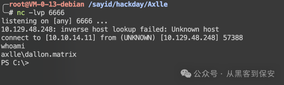 在靶机下载快捷方式文件 rev.url 前,先 nc 开启端口监听,待 C:\inetpub\testing 目录下载rev.url 后就能成功拿到 dallon.matrix 用户的 shell
