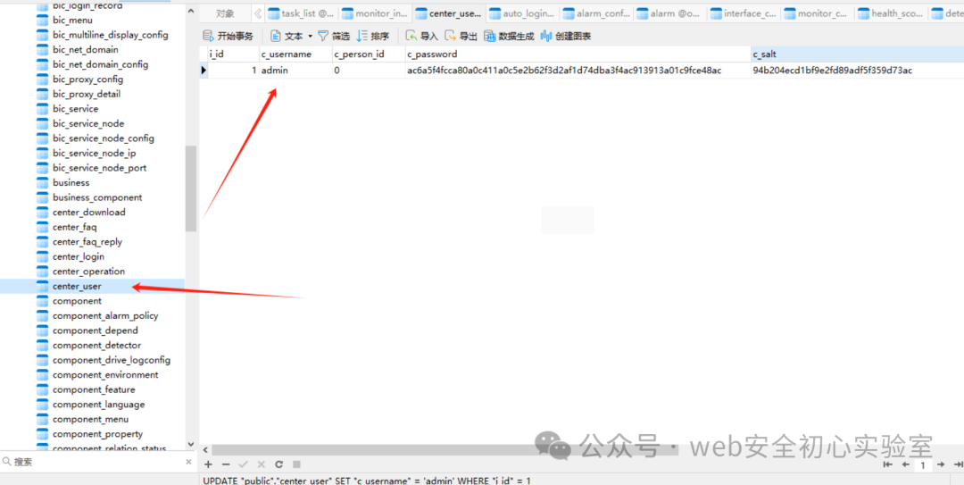OK下面继续切入正题,这里我解密的他的postgres数据库密码后连上去后就找center_user这个表