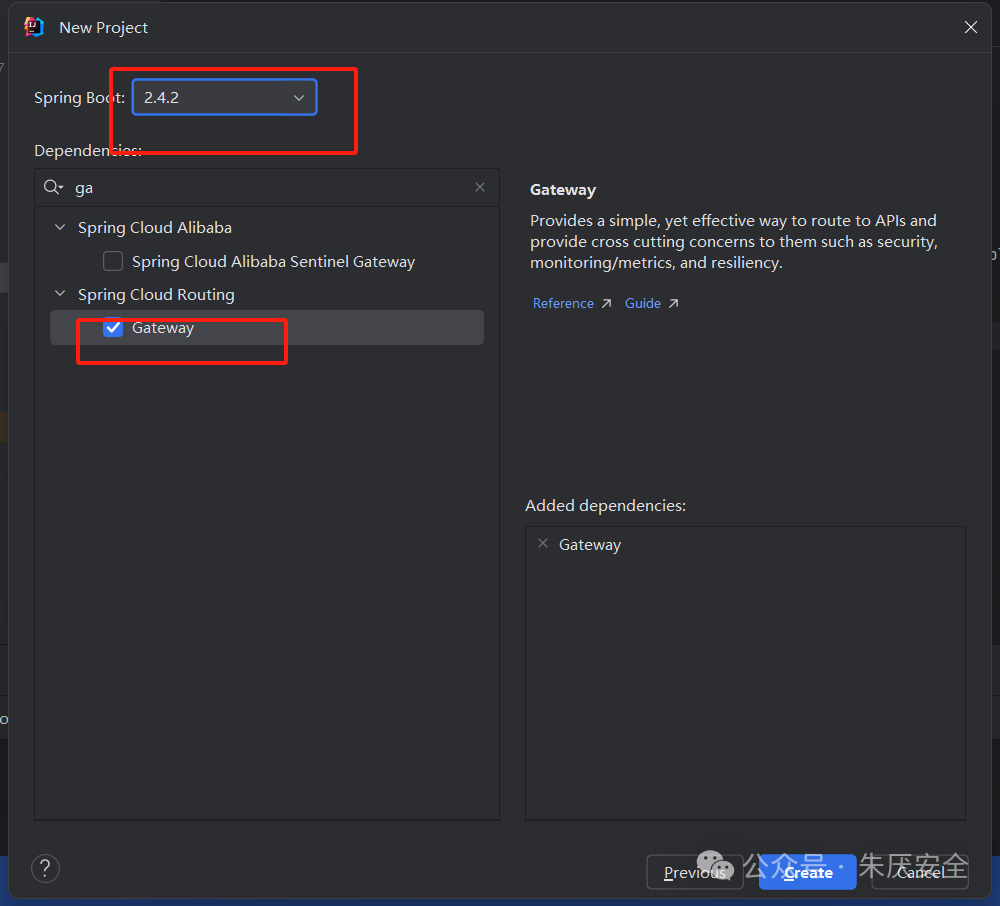 搜索Gateway,勾选Gateway,这里注意一下坑点,选择springboot点击后Springboot上面的版本会变回2.6,注意要改回来,然后点击 创建