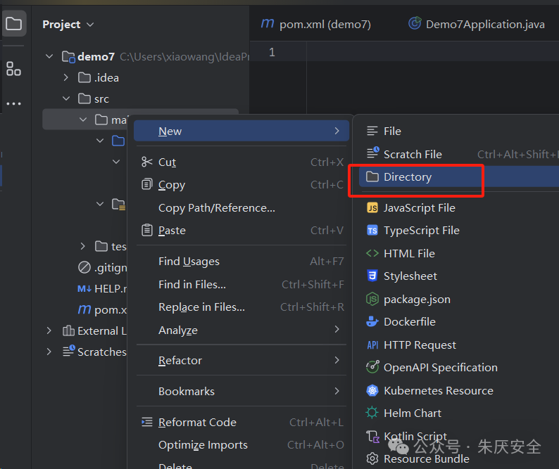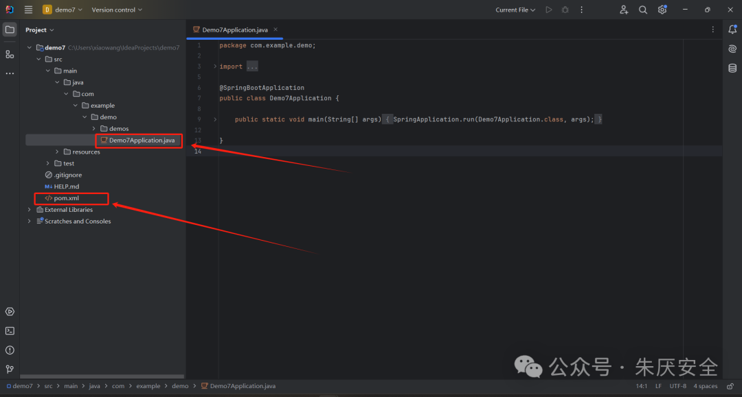 这里给没有Java基础的友友理解一下,Demo7Application 是主文件,是程序入口(main方法在这里)