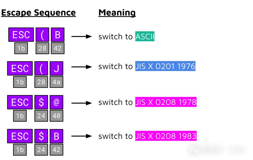 ,这些字节不会解码为字符,而是指示所有后续字节应使用ASCII解码。总共有四种不同的转义序列可用于在字符集ASCII、JIS X 0201 1976、JIS X 0208 1978和JIS X 0208 1983之间切换: