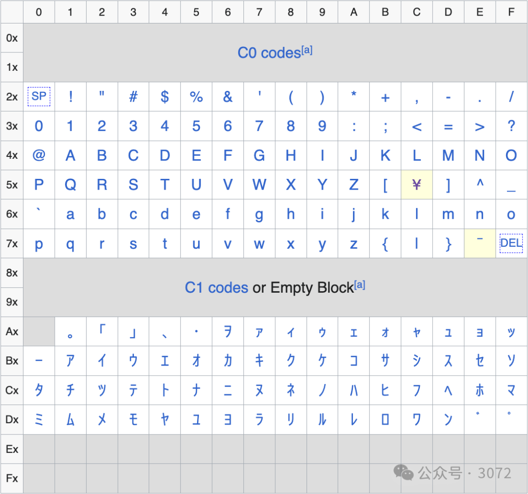 如我们所见,这仍然会导致与之前相同的字符,因为JIS X 0201 1976主要与ASCII兼容。然而,如果我们仔细查看其代码表[20],我们会注意到有两个例外(以黄色突出显示):