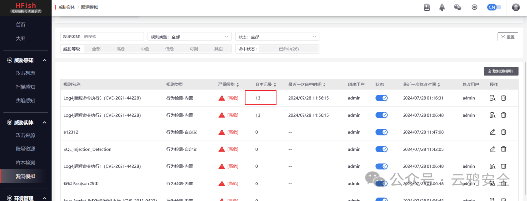 后面可在漏洞模拟模块下选中命中记录查看完整的攻击请求包,