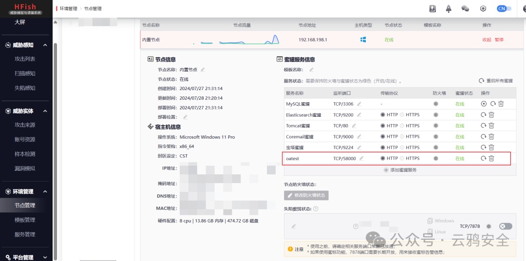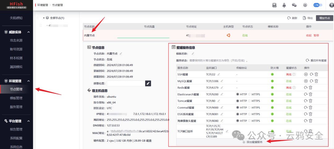 在节点管理-内置节点下添加蜜罐服务