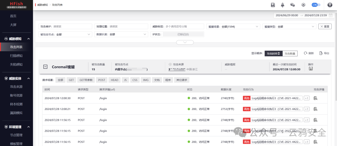 管理平台这边可以看到攻击列表成功已经成功捕获到了攻击行为: