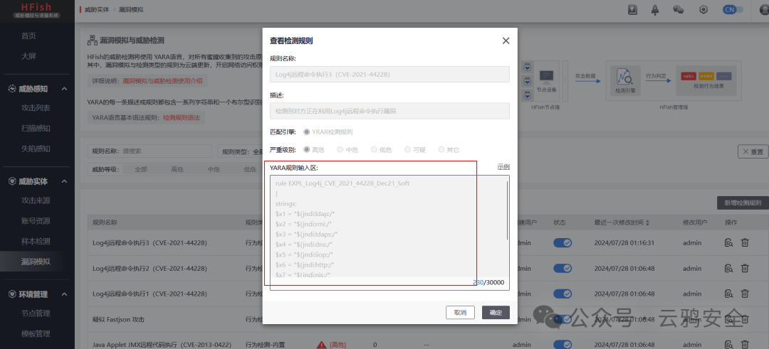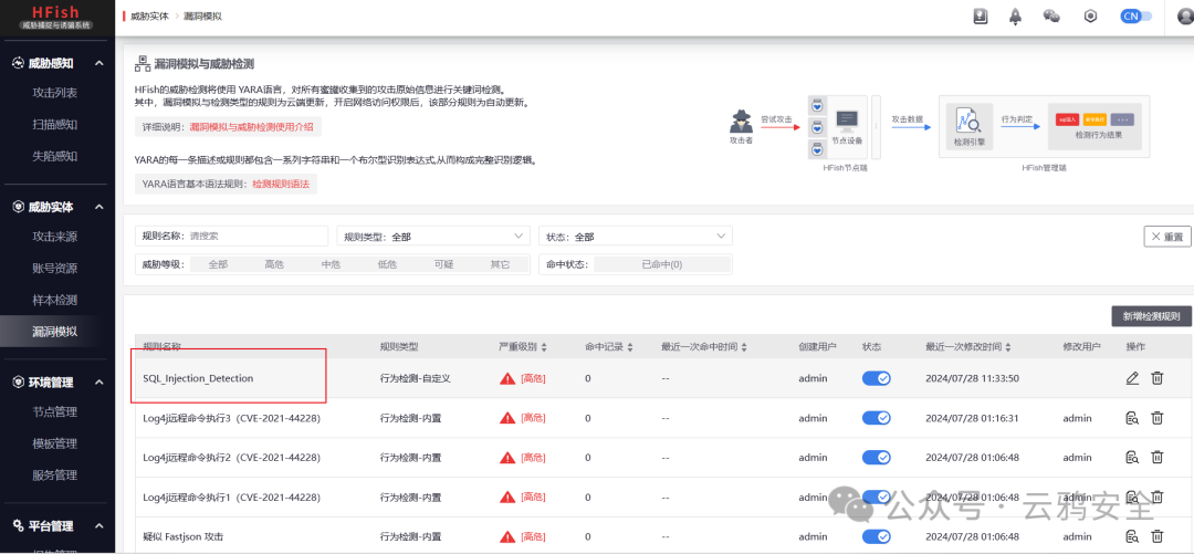HFish的过滤检测是使用YARA语言,对所有蜜罐收集到的攻击原始信息进行关键词检测,支持自定义规则。