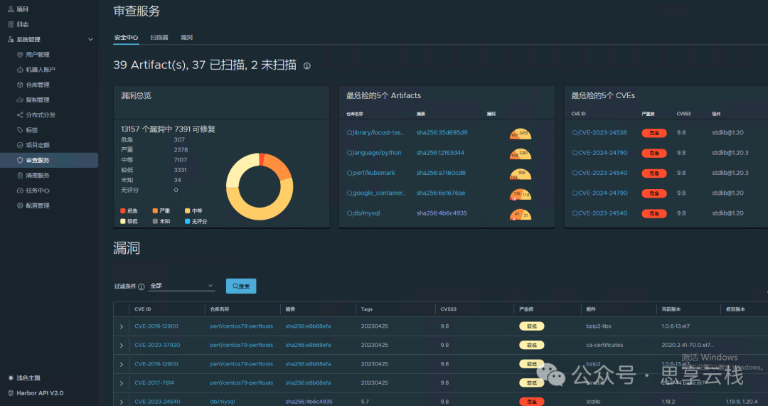在审查服务中,harbor还提供了安全中心,展示镜像漏洞的概览。在漏洞菜单可以配置漏洞扫描的策略,可以手动触发或者配置定时扫描。