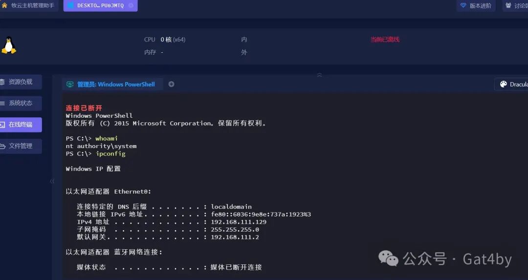 这里用的是某亭的远程主机管理工具,只要受害者访问下载安装后,我这边就能马上上线操作他的主机。
