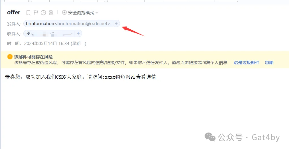 受害者成功收到钓鱼邮件,一般qq邮箱会过滤而163邮箱不会过滤,可以看到是csdn的hr给我们发送的邮件。