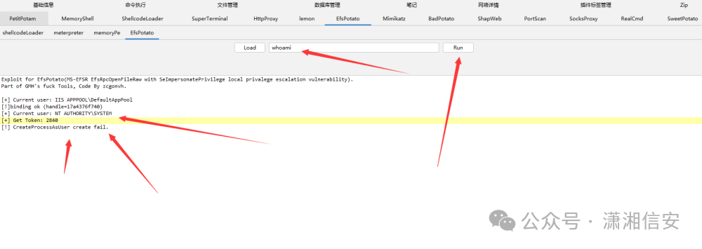 这里我们先试试用哥斯拉自带的土豆提权试试,可以看到虽然拿到了system token,但是在CreateProcessAsUser