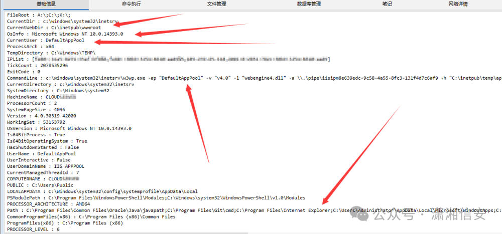 拿到webshell后收集到以下信息,但无法执行命令(被拦截),这里应该找可读可写上传cmd