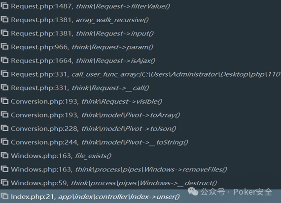 5、访问网页,然后使用xdebug进行动态调试,一次次步入由下图可以发现整个rce执行pop链。