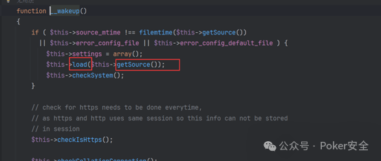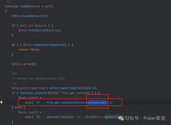 4、接着去跟踪这里出现的load以及getsource函数,先看这里的load函数,load函数使用了eval以及file_get_content危险函数,这就可能造成命令执行或者任意文件读取漏洞,刚好这里的参数里有getsource函数。