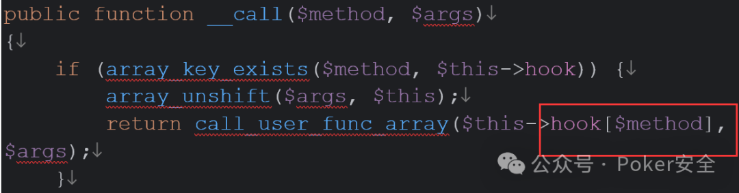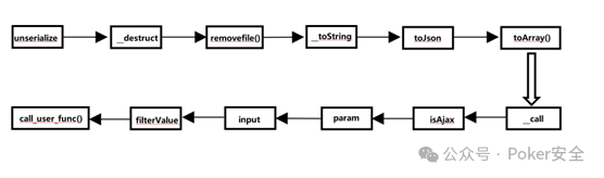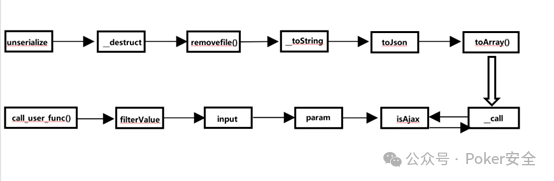 2、这里新奇的思路就在于逆推,上文已经提及pop链的终点函数,所以我们就可以从终点向起点跟进,即从call_user_func()向前,当跟到isAjax函数时终止,而刚好_call函数下的hook可控,我们便可以给其赋值为isAjax,这样两个链子就栓在了一起,形成了完整的一条链。