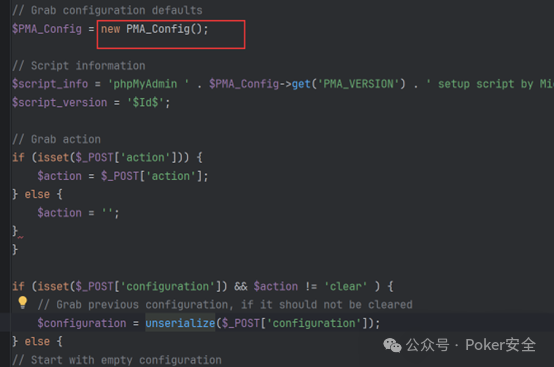 6、最后我们先梳理下整个流程然后进行简单pop链编写,流程:unserializ-->__wakeup-->load函数-->eval以及file_get_content危险函数,而unserializ函数这里有可控参数configuration,并且要在configuration不为空、action!=clear的情况下才可以执行,getsource函数获取了变量source。所以我们的pop链就容易编写了,由上文提及的反序列化原理可知我们需要构造一个危险对象然后序列化成字节流,对象就是PMA_Config,然后对象中要包含我们定义的变量source来进行文件读取。
