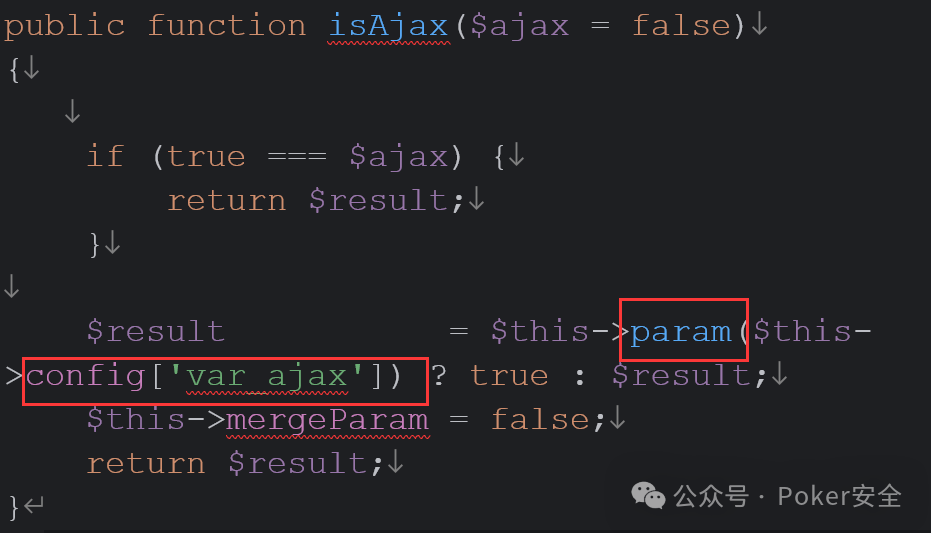 11、跟进isAjax()这里的config可控,所以param中的name可控以及上文的hook均位于request类中