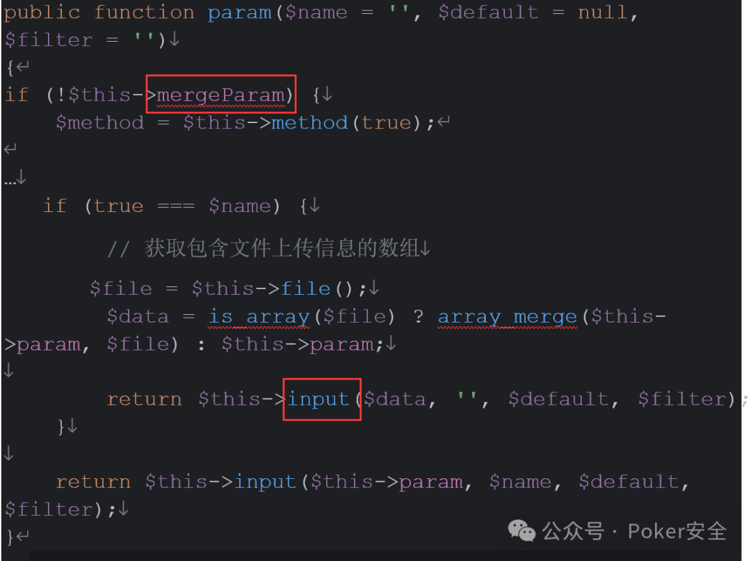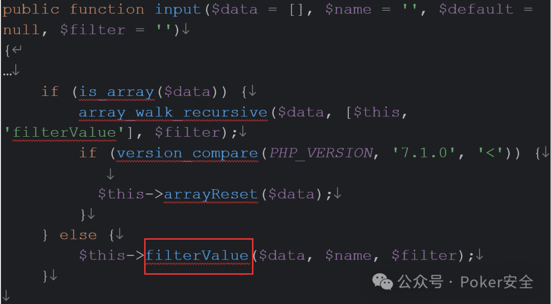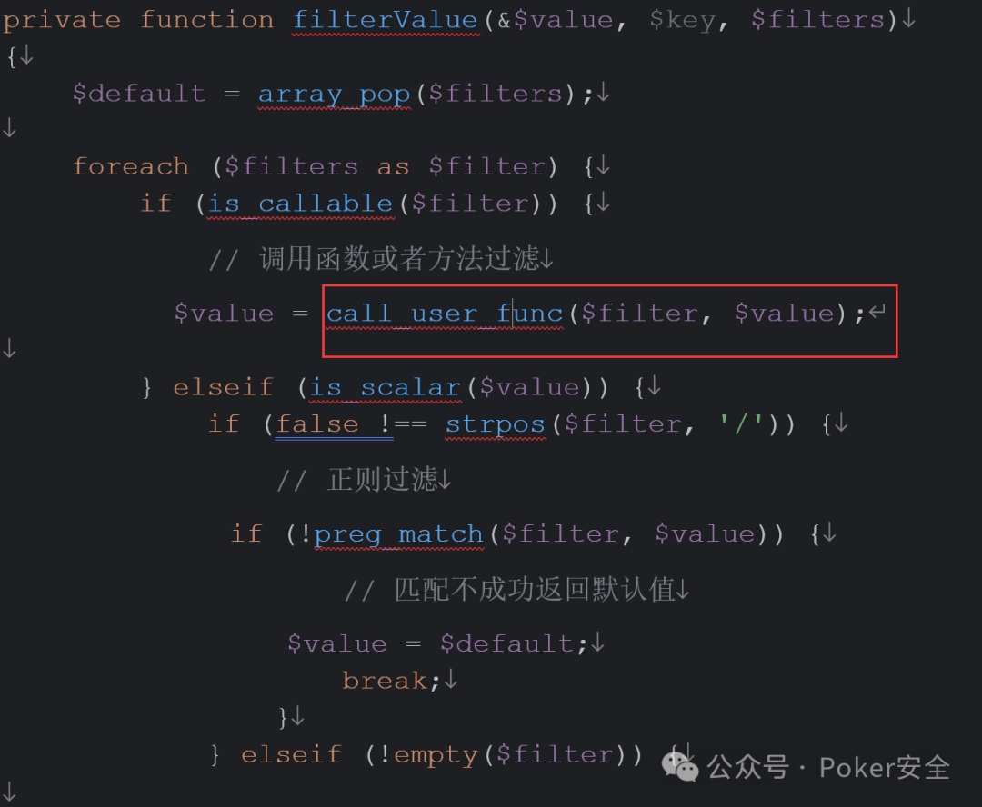 14、继续跟进filterValue(),filterValue()中发现导致rce函数call_user_func(),并且filter可控,这里再总结一下上文提及的config,param,hook, mergeparam以及这里的filter均位于request类中