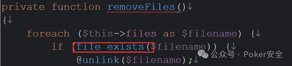 2、我们这里跟进removeFiles(),file_exists()函数根据定义,此函式将参数转化为 string 类型再进行查询,因此触发toString()魔术方法。
