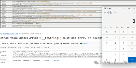 3、然后我们访问/public/index.php/index/index/unser并给id传参(我们提前在网上找好的poc),成功弹出计算器。