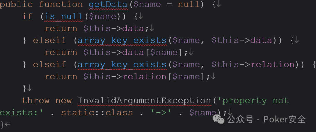7、我们跟进getRelation(),这里我们就需要传$key参数,内容必须是数组,所以$name不为空,进入 elseif,最后返回relation[]
