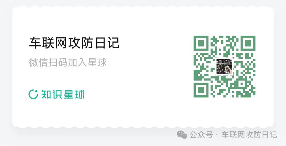 本人长期从事车联网攻防一线,如果你是一个车联网攻防的长期主义者,欢迎加入我的知识星球,我们一起往前走,每日都会更新,微信识别二维码付费即可加入,如不满意,72 小时内可在 App 内无条件自助退款。