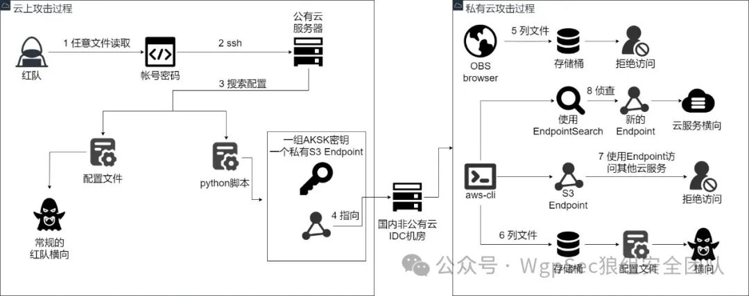 在公司的一次攻防演练的过程中,我通过web的一个任意文件读取漏洞获取到目标服务器的数据库帐号密码,恰好这是一个开放ssh的linux公有云服务器,经过尝试发现,数据库帐号密码同服务器密码,于是很顺利地利用ssh登录到服务器中。经过文件的翻找,我在这台服务器中找到了有一个配置文件,其中包括了一组accesskey密钥和secretkey密钥以及一个自建的云服务端点地址。通过这一个配置文件发起了对非公有云环境的横向,下面是攻击路线的概览