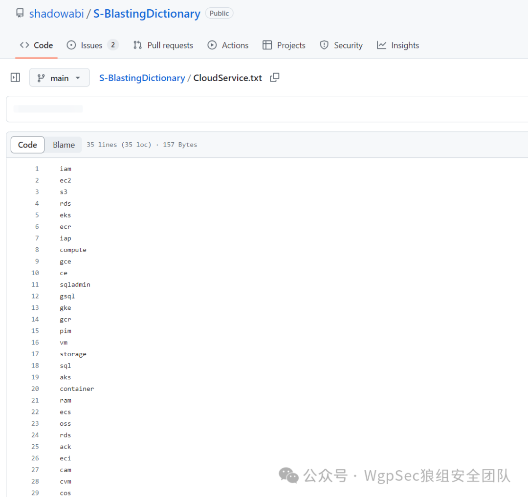 但按照aws的命名规则,对象存储叫s3,而阿里云的命名规则才是存储桶是oss,也就是说这里的云服务端点的命名并不遵循AWS的叫法,而是按照创建者自己理解的命名去制作的云服务端点。综合考虑下来,我认为这个命名大概率会取某个公有云的相同命名。为了去嗅探这个云服务端点,我开始搜集了aws、google cloud、azure、阿里云、腾讯云、华为云六家对应云服务的缩写,最终做成了一个字典: