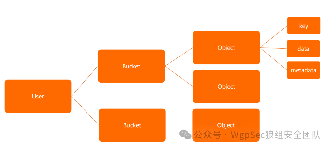 在这个python脚本中,目标使用了一个的aws s3的sdk,大致操作是通过向云服务端点请求对s3云服务进行操作,获取bucket内的一个object里的文件,并且读取里面的内容。亚马逊AWS(Amazon Web Services (AWS) )是国外的一个云服务供应商,类似于国内的阿里云,s3是aws 提供的一项对象存储产品服务,类似国内的oss云存储桶。一个存储桶内有多个bucket,每个bucket内存放object,object通常就是具体的文件,文件的内容则是object的key。对象存储的结构如同所示