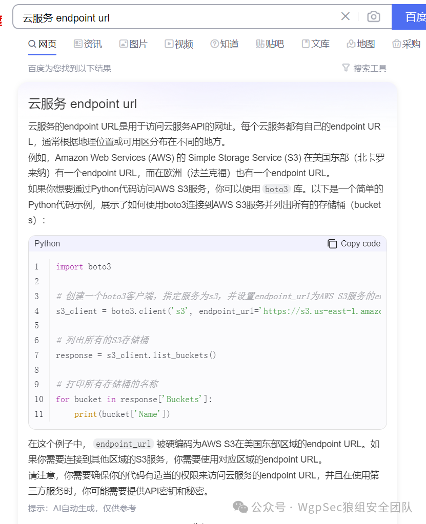 这里aliyun CLI会先去访问location-readonly确定Endpoint再发起请求,最终发起的请求和在云api平台上发起的请求是一致。这里的Endpoint,阿里云称为服务地址。实际上在不同的云他有不同的称呼,比如在腾讯云则称为请求域名。在移动云被称为终端节点。在aws和azure都被称为service endpoints。由于endpoint本身就会有很多种意思,而上述的称谓都有出现歧义的情况,所以这里,我推荐百度搜索“云服务 endpoint url”,百度ai很贴心的解释了这个: