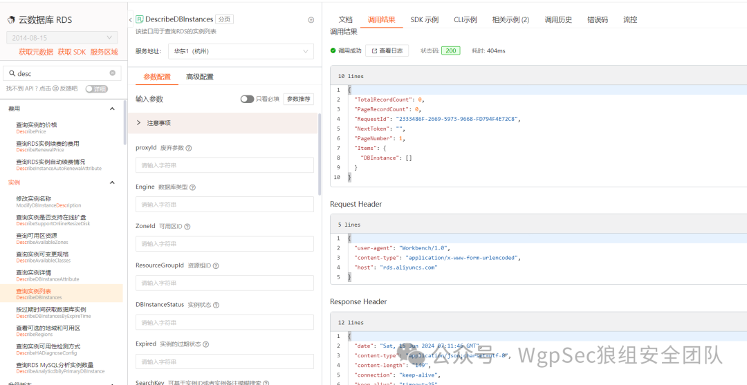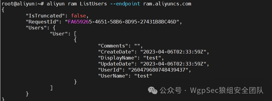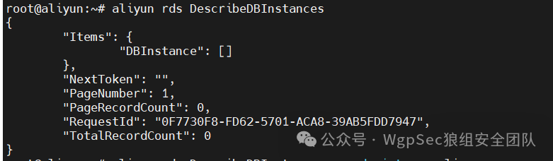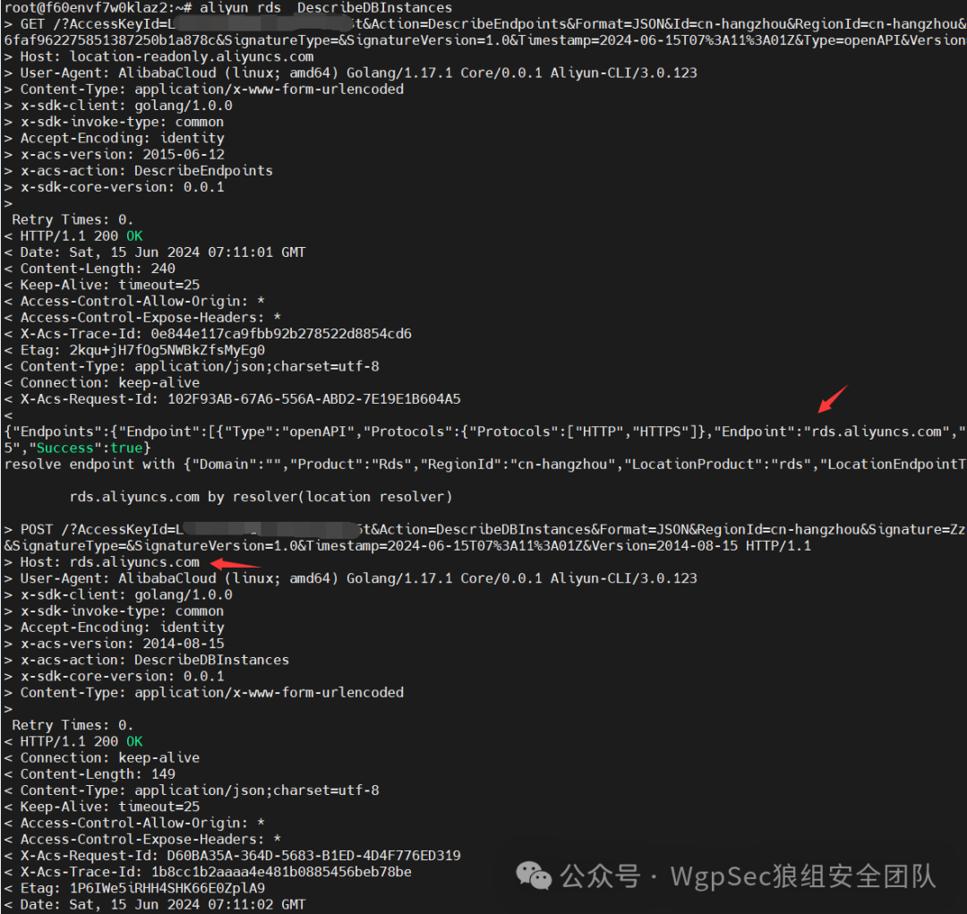 在这里,我找到了一个py文件,里面有其他云数据库的帐号密码,可以继续横向即攻击路线6。除此之外,我还思考了一个问题,面对私有云,能否可以像公有云一样,直接操作其他的资源,比如说我用s3 的云服务端点去实现类似 aws iam list-user (列举当前云的iam用户)的操作呢?经过尝试我发现是不可以的,也就是攻击路线7遇到的情况,大致类似于下面的操作:这里我通过阿里云改变云服务端点来模拟私有云的请求。当我们请求操作阿里云的rds(云数据库),不附加云服务端点,会使用默认云服务端点,请求正常。