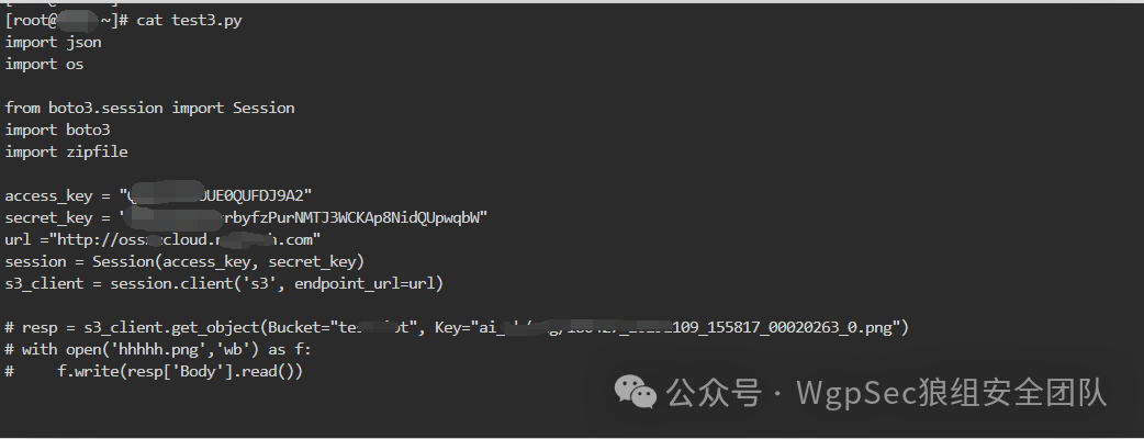 关于云服务端点前面已经介绍,对于具体的实施可以参考k8s的apiserver处理来自 kubectl的请求。我们注意3号攻击路线,这里我们分了两个分支,主要看右边的攻击路线,如下图所示,我们通过翻找文件,拿到了一个包含一组AKSK密钥和一个私有S3 云服务端点的python脚本