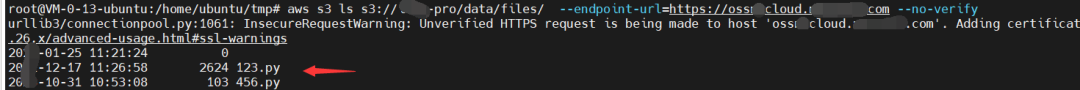 通过 --云服务端点-url 参数附加上指定的云服务端点 地址,如果目标有SSL证书强制校验的话,则需要在请求时附加上证书文件,这里不存在强制校验,仅仅只是要求使用https协议,所以可以直接--no-verify去跳过证书警告