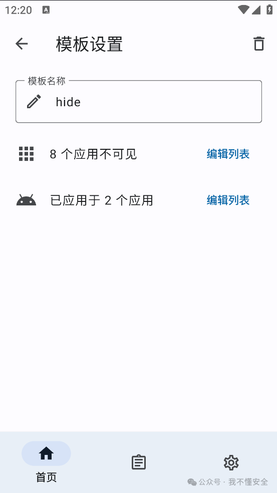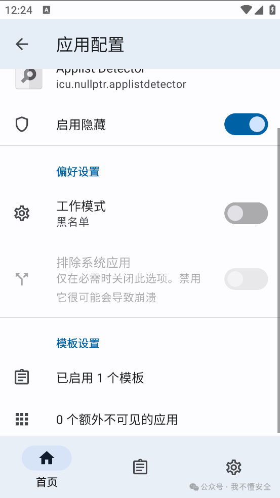 而后返回到应用配置,再次选择想要应用的app,比如说我的icu.nillptr这个app对框架和root有检测我需要单独绕过,就把这个勾选,然后工作模式为黑名单,选择我们的模版,即可