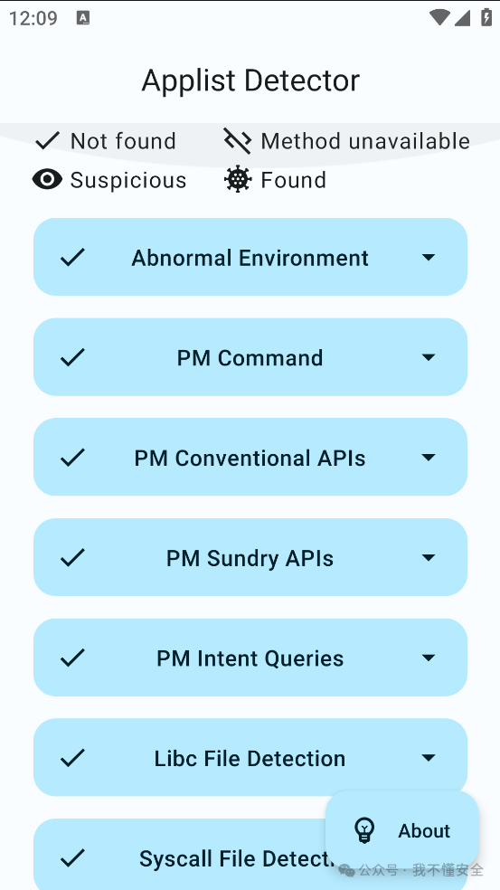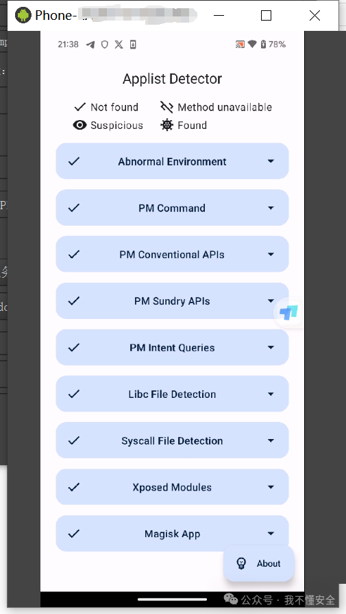 在测试的时候发现,我们单独安装的lsp.apk无论如何也隐藏不起来,所以又把单独安装的lsp安装包给卸载了(卸载的不是lsp框架,只是寄生器安装包),但是其实还是有点问题,下图为黑白名单自带检测,是全过的