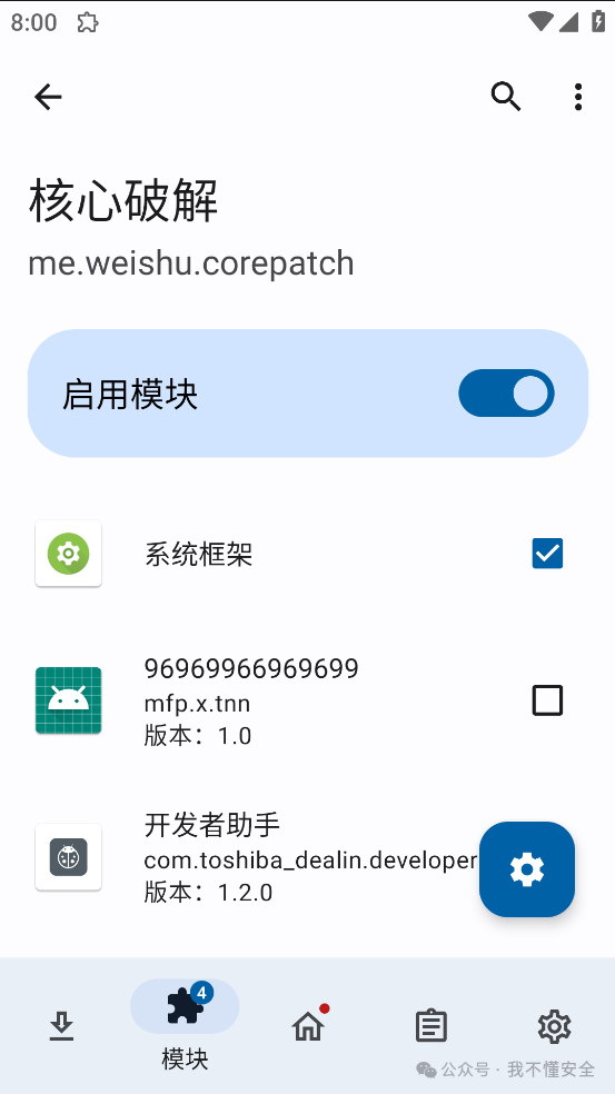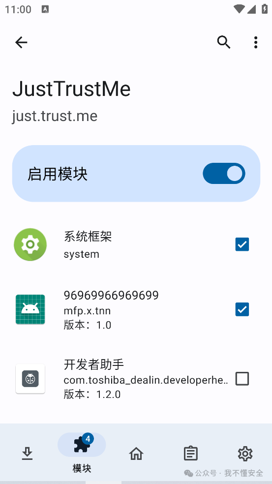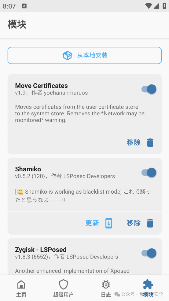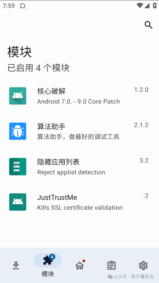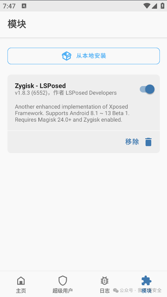 不疑有他,所有apk的都可以直接安装进去,一般xposed框架的模块都是apk可以直接安装的,有些框架是有GUI的,会有单独的入口,有些xposed框架只能在lsp框架的模块才能看到,而zip压缩包的模块一般都是面具里面的,本次案例安装步骤不再一一演示,直接给大家看部署后的样子