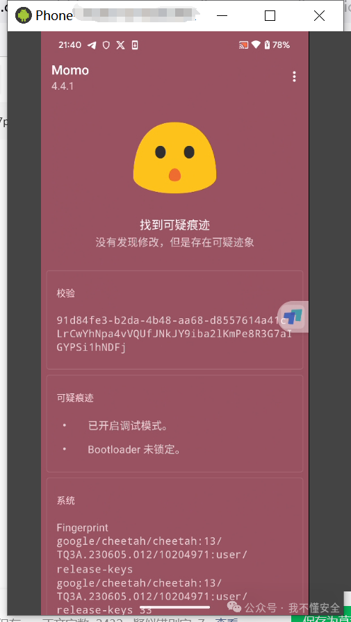 其实在这里的时候,笔者遇到了另一个问题,在这里记录一下;笔者前面安装了Magisk和Shamiko模块,而这里的Magisk可能版本比较低,Shamiko模块的版本也比较低,这就导致了在进行adb shell的时候,会提示unauthorized,也就是没有权限,这是因为Shamiko模块会把ro.adb.secure变成1,也就是开启adb密钥校验,因此会出现无法连接adb的问题,那么此时可以将面具换成狐狸,或者临时关闭Shamiko模块;实际上在测试的时候,笔者的实体手机是不会出现这个问题的,在这里仅作为提醒(也有可能是1版本以后的Shamiko修复了这个小问题)