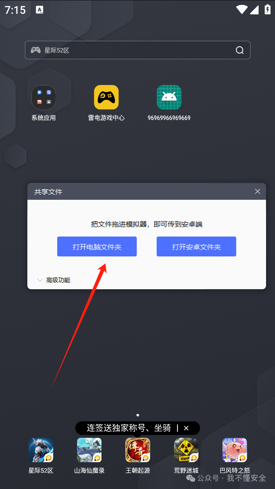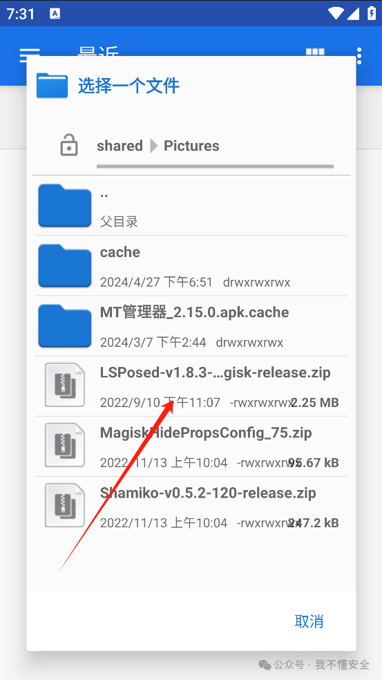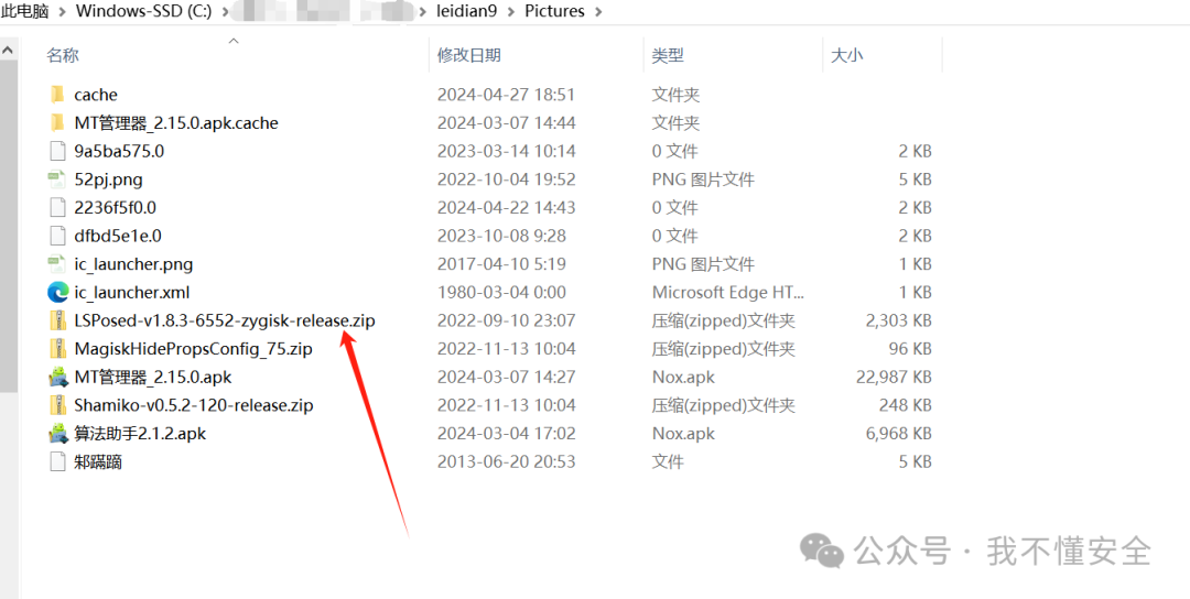 重启后生效,接下来安装lsp框架,这个lsp框架是压缩包形式,安装到面具里面的,所以我们可以先adb push到模拟器的目录里,也可以利用雷电模拟器的共享文件功能将文件存放进去,存放进去的目录是在模拟器的picture目录