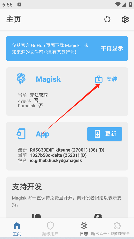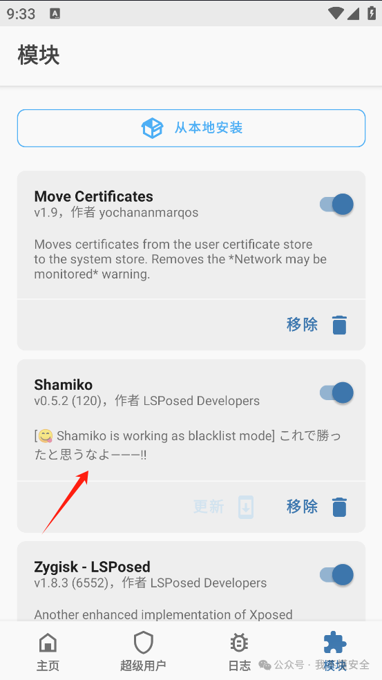 Shamiko该工具可以部署在面具模块里,面具模块自带的隐藏Magisk功能开启后,会影响app的测试,但是这款插件完美的解决了这个问题,在设置了xxx应用的隐藏后,我们不需要真的开启隐藏功能,Shamiko就会帮助我们隐藏root,同时并不会影响我们测试(推特app可以利用此方式绕过root检测),笔者这里使用的面具版本有点略低,建议用高点的版本,否则会很不爽利