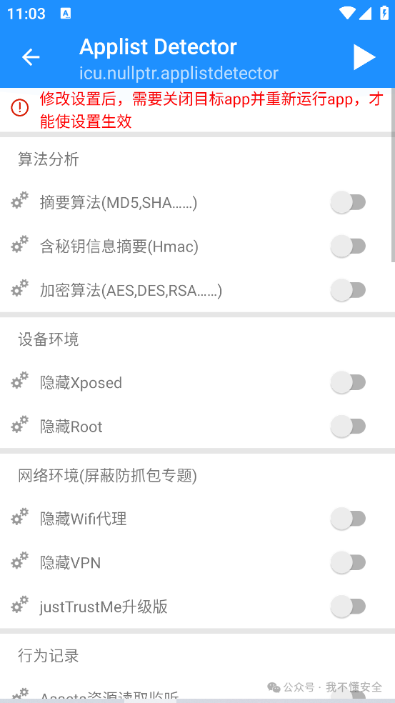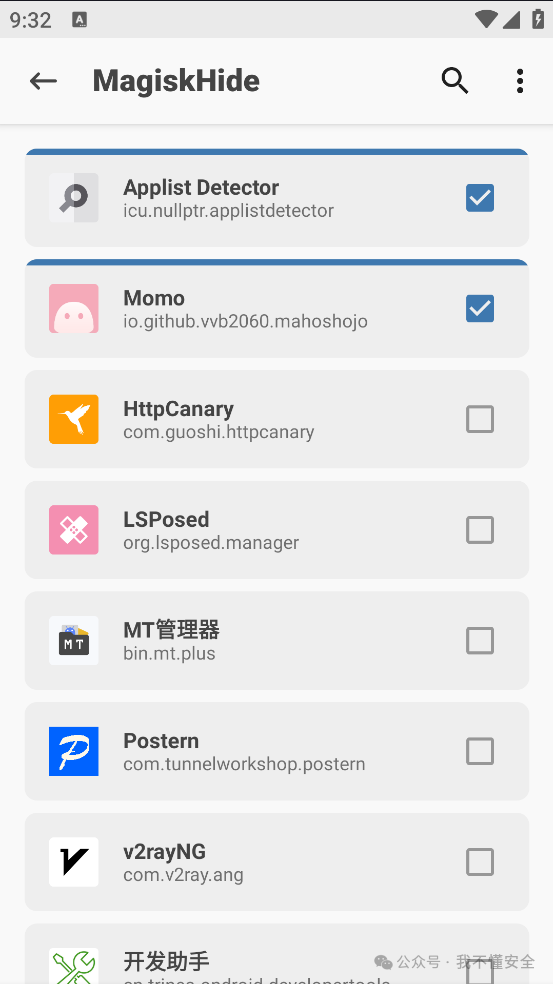 HMA-V3.2 此工具堪称apk逆向必备神器,为什么这么说呢,因为此插件可以实现黑白名单功能,顾名思义,就是此工具可以针对app设置黑白名单,例如设置黑名单,将部分app,如:面具、lsp相关框架、root组件对其隐藏,那么加固了的app就无法查询到相关的包名或文件名,从而实现一个root、框架的检测绕过(例如某银行app可以利用此方法绕过root/框架检测)
