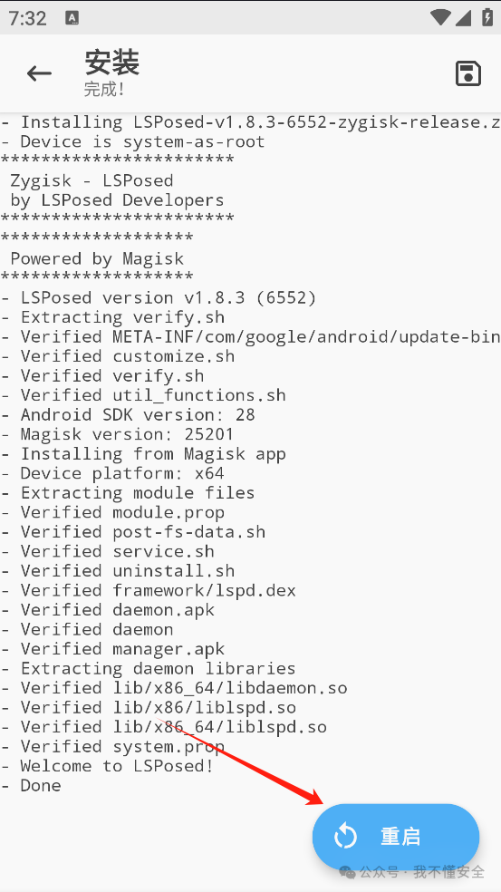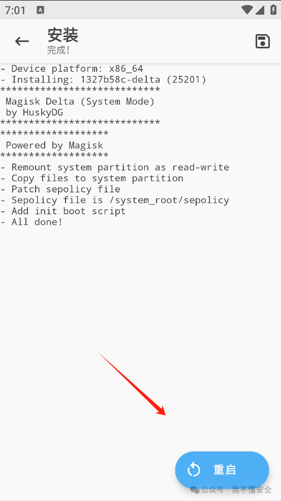 保存后重新启动即可,接下来安装面具,可以直接拖进去,也可以adb install,安装完毕后,直接赋予root权限,然后修复即可