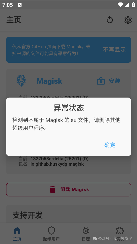 重新启动后,再次打开面具,会提示检测到其他su文件,直接x掉就行