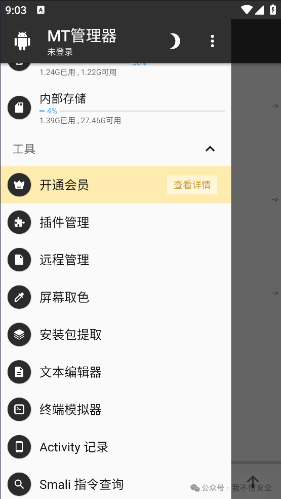 MT管理器,这是一款史诗级文件管理器,安装后可以给root权限,会员仅需200+即可获取永久会员,而MT管理器项目已经平稳的运行了N年了(笔者记得笔者高中的时候就用过这个),所以也推荐大家知识付费,支持一下开发大佬们,该工具可谓是逆向神器,常规的软件双开、签名绕过、dex逆向、Activity记录等,好用到爆