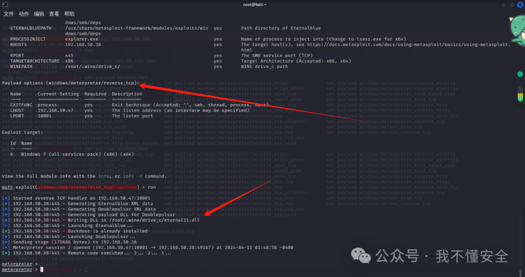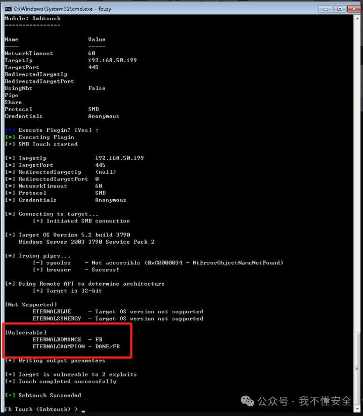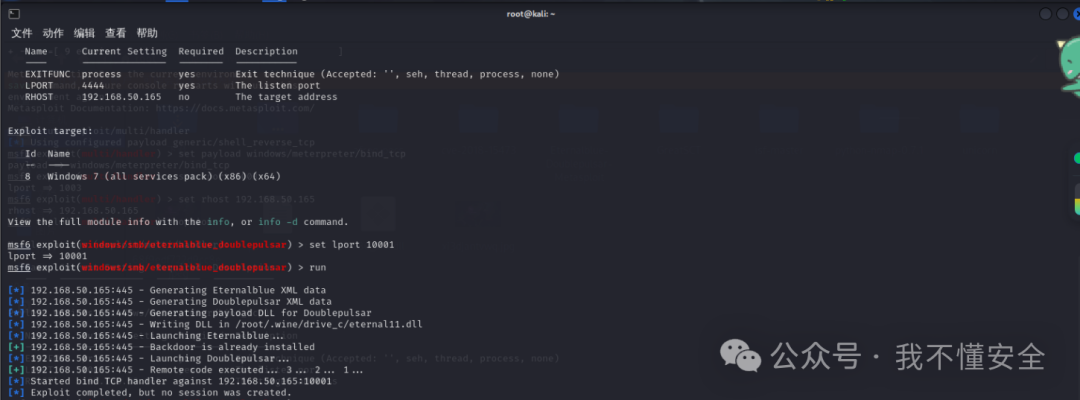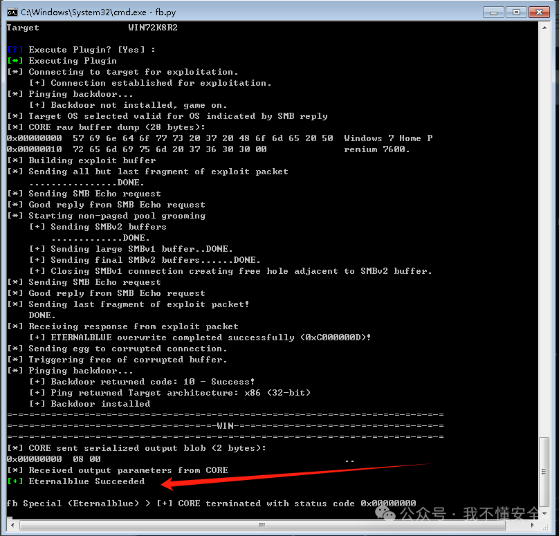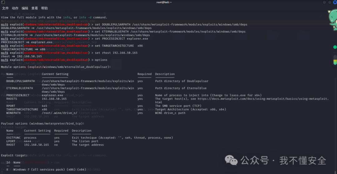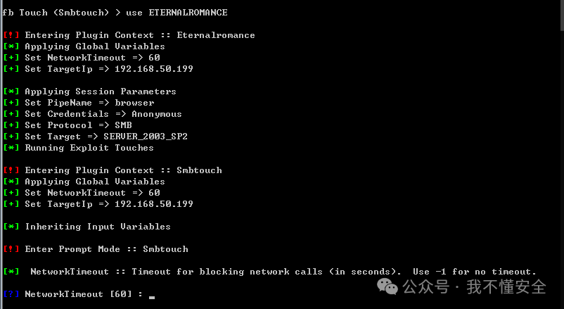 Smbtouch模块为漏洞检测模块,可以看到,成功的检测出了永恒之蓝漏洞;接着直接进行漏洞利用