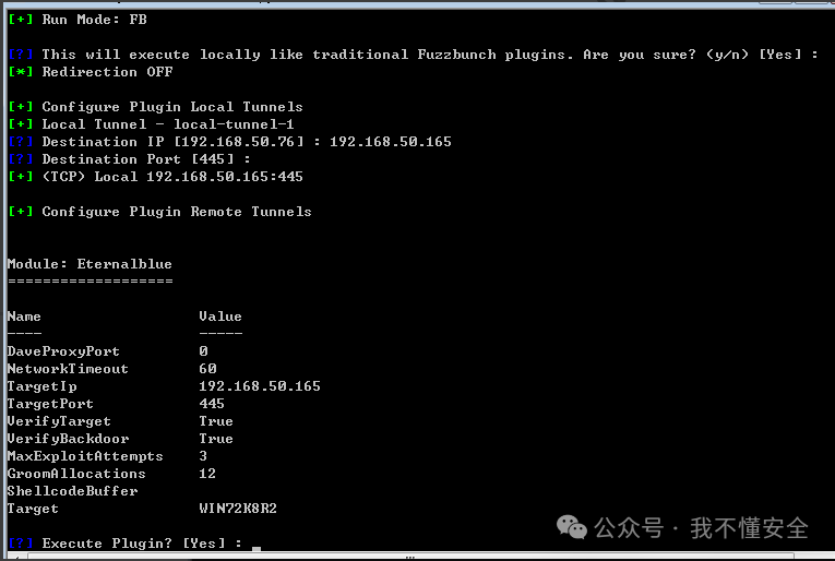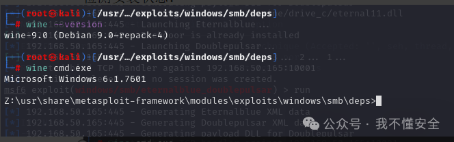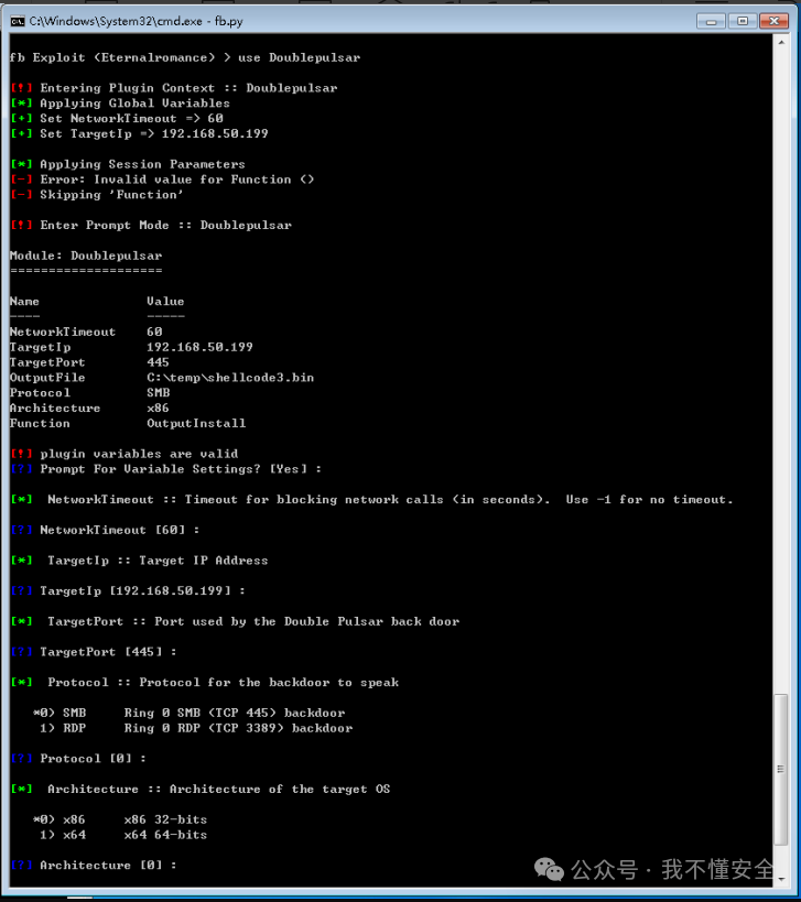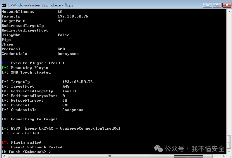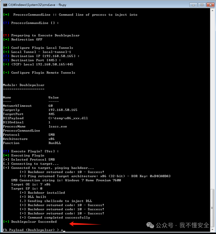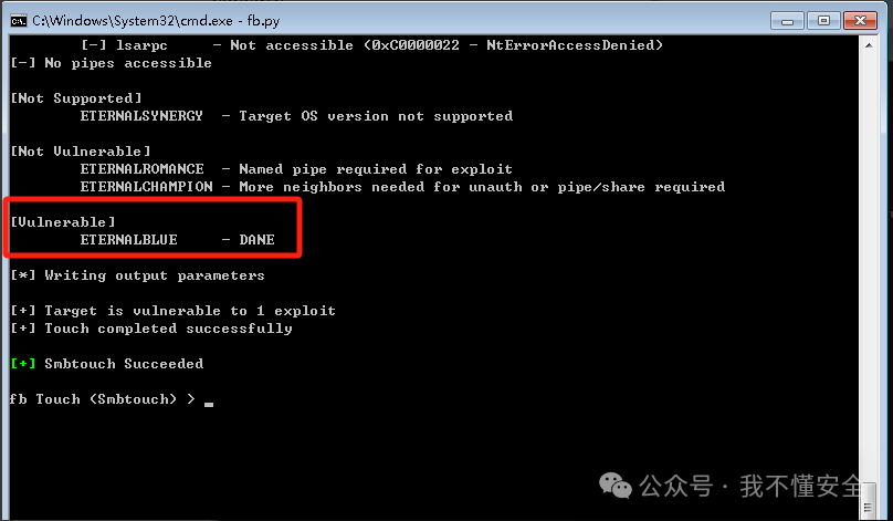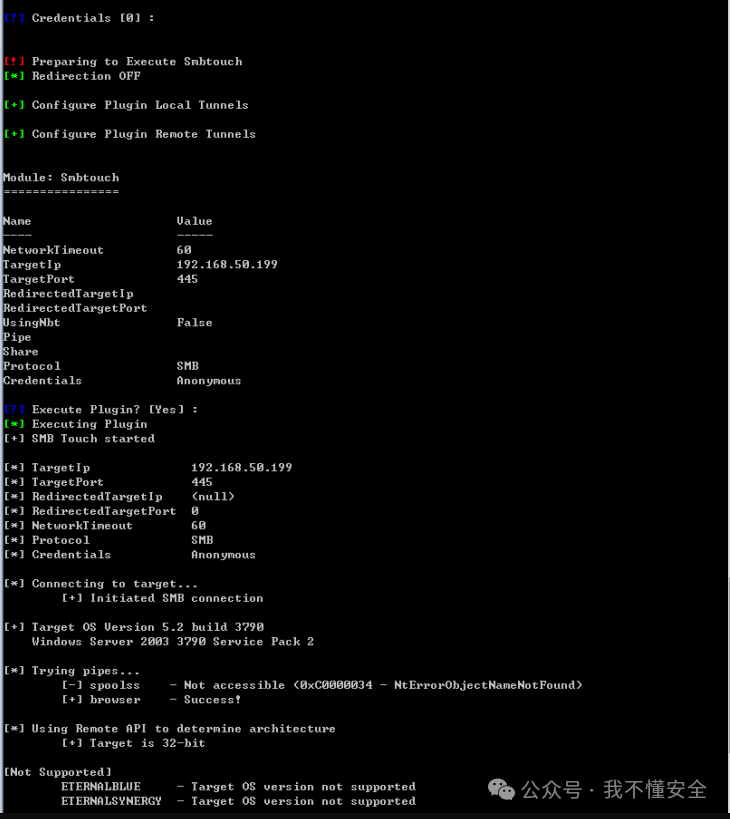 Smbtouch模块为漏洞检测模块,可以看到,成功的检测出了永恒之蓝漏洞;接着直接进行漏洞利用
