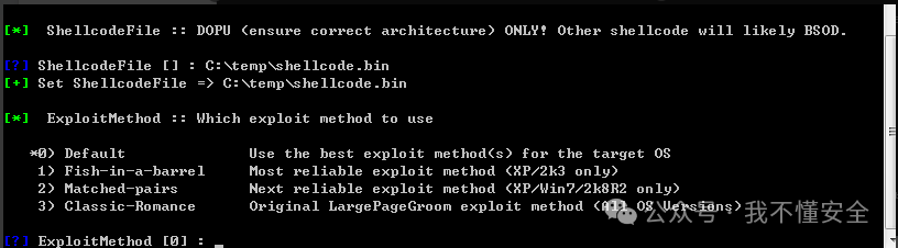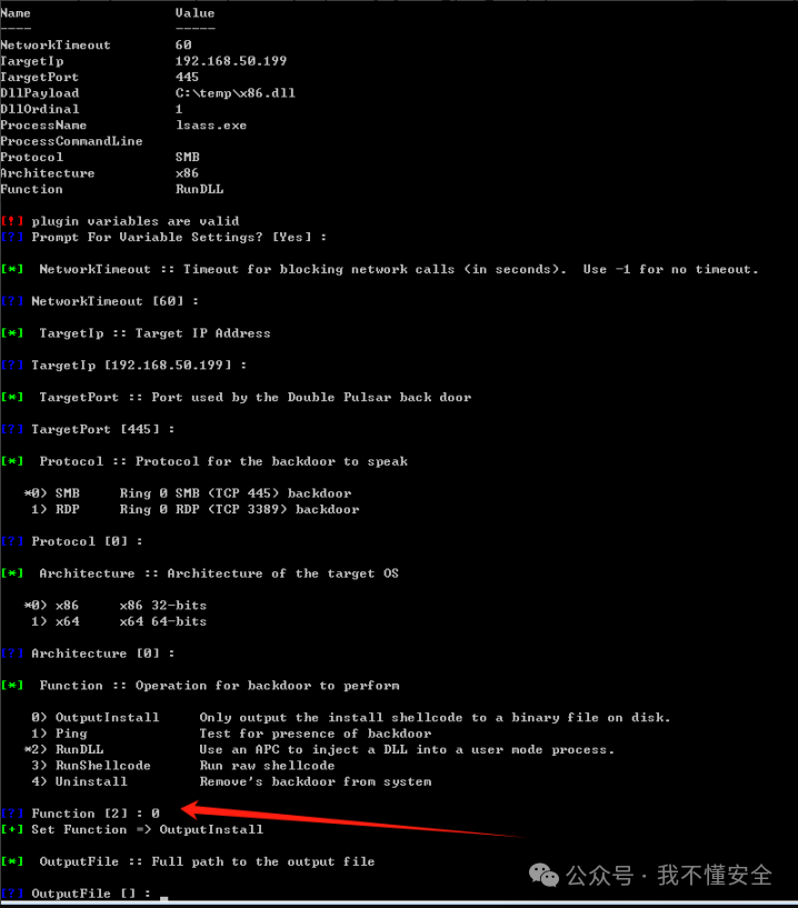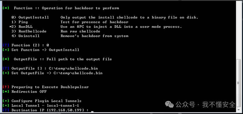 然后选择0,OutputInstall ,并设置路径,这里路径设置成 c:\temp\shellcode.bin