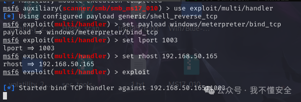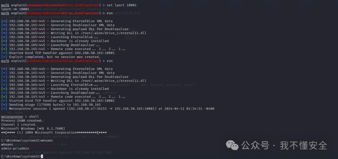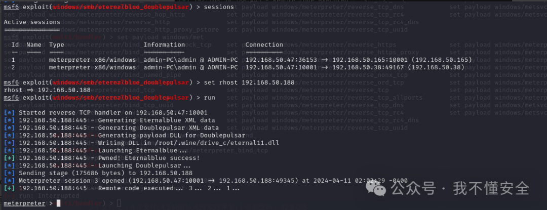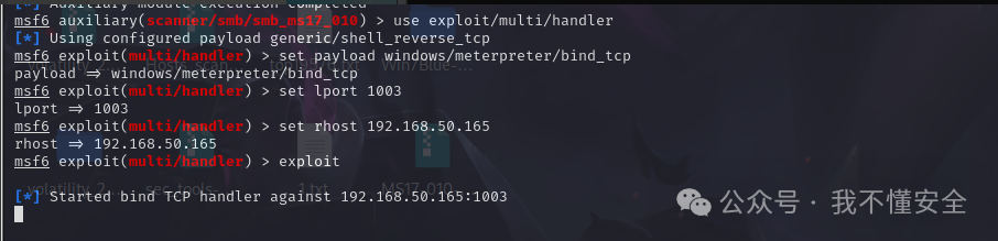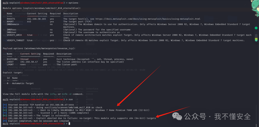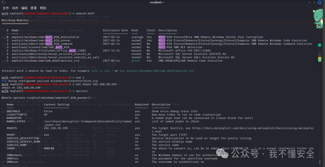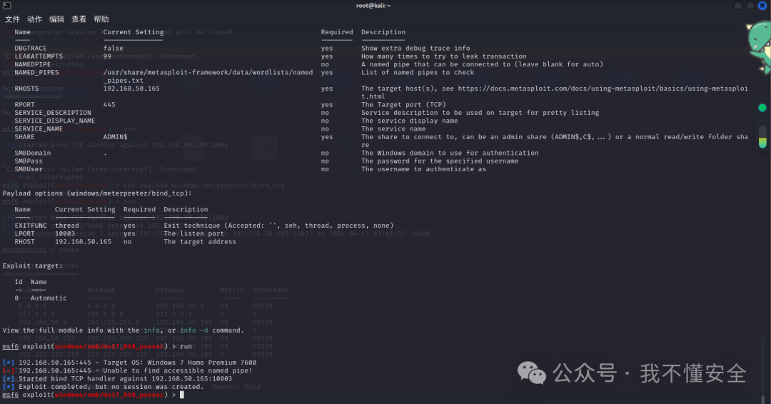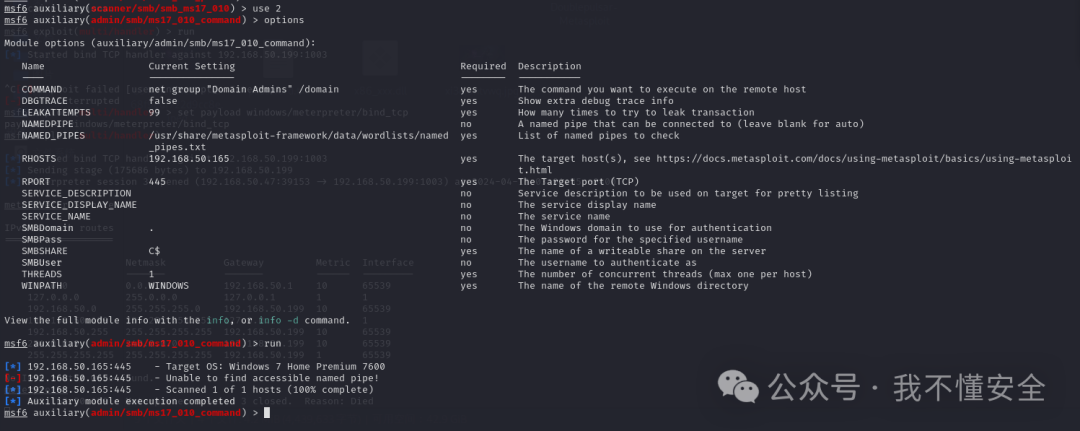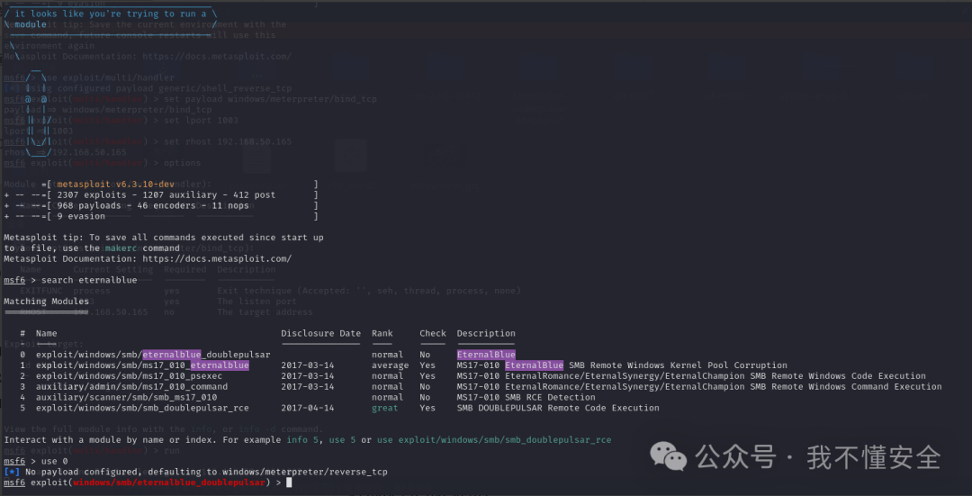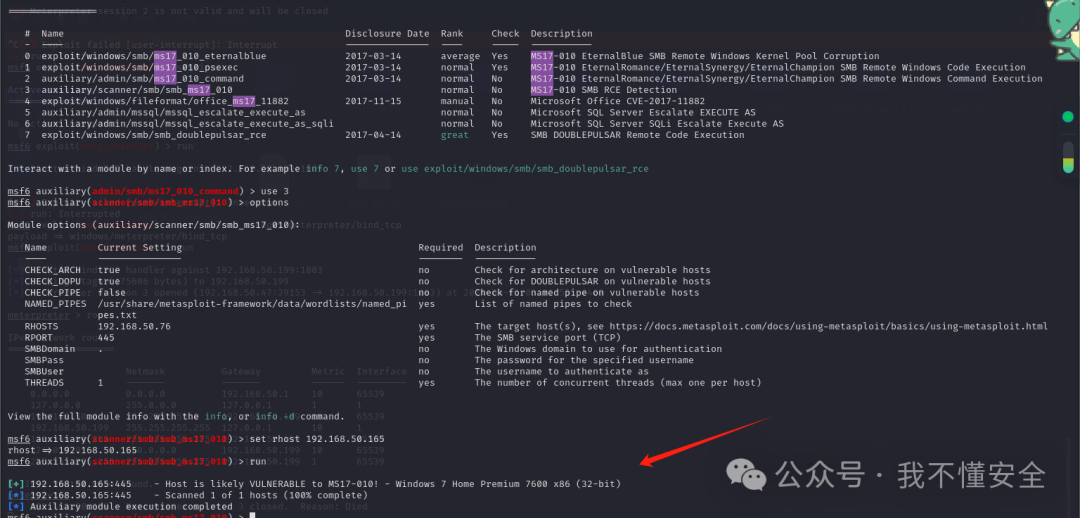 可以确定,ms17010是存在的,接着我们尝试一下msfconsole的exploit/windows/smb/ms17_010_eternalblue